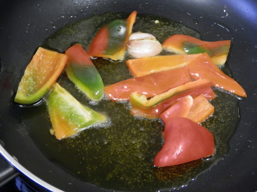 Cuando estén calientes, añadimos los ajos y el pimiento y sofreímos.