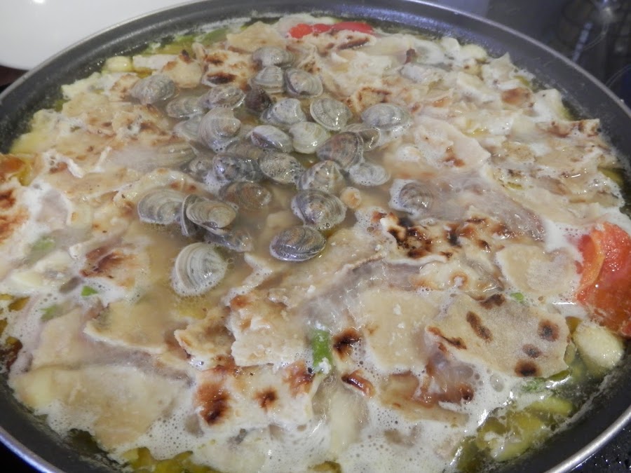 Cuando ya esté la torta cocida y las almejas abiertas, apartamos del fuego y dejamos reposar unos diez minutos más.