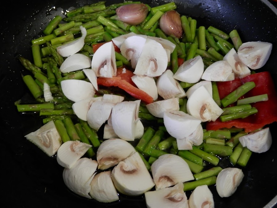 Partimos los champiñones en trozos y los espárragos a tacos pequeños.