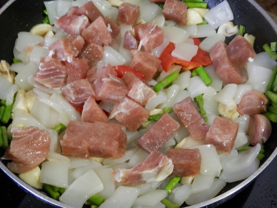 Cuando los tengamos sofritos añadimos el atún y el calamar y damos unas vueltas hasta que estén sofritos.