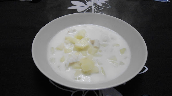 En una olla ponemos agua a hervir , añadimos las patatas cortadas a trozitos y la rosada, cuando esta cocido, hacemos una mayonesa con el huevo y el aceite de girasol ( se le echa una poca de agua para que no espese tanto), la apartamos del fuego y dejamos que se temple un poco, le añadimos la mayonesa, el limón la sal y listo.