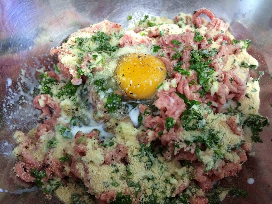 Comenzamos haciendo las albóndigas. Para ello colocamos en un recipiente amplio de cocina la carne picada, el huevo, la leche, los dientes de ajo y el perejil finamente picados, la nuez moscada, sal y pimenta. Agregamos el pan rallado y mezclamos bien todo el conjunto.
