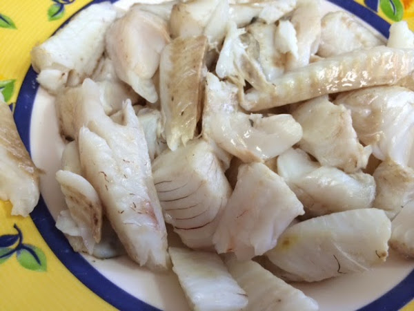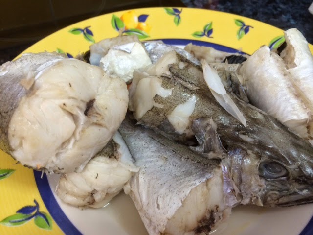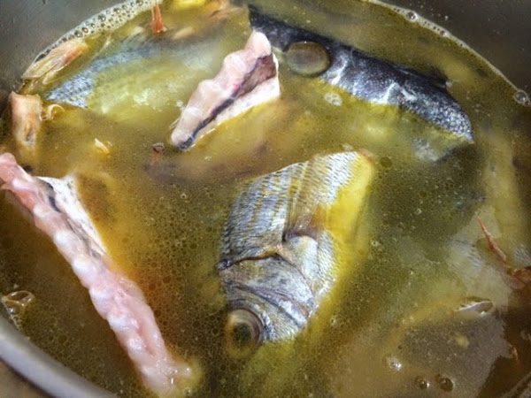 Pescado para hacer el caldo base (en este caso 2 herreras y la cabeza y espina de una merluza)