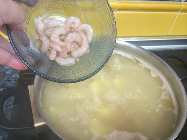 Cuando las patatas estén hechas, le añadimos las gambas que teníamos reservadas y las pescadas limpias.