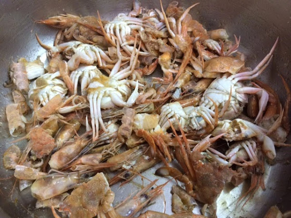 Lavamos y pelamos las gambas reservando los cuerpos en el frigorífico. Partimos los cangrejos por la mitad y rehogamos en una cacerola amplia con las cabezas y cáscaras de las gambas añadiendo una cucharada de aceite de oliva.