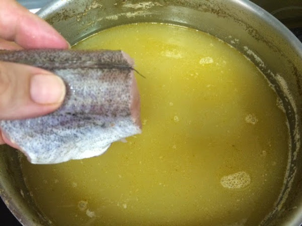 Ponemos la pescada en el caldo y llevamos a ebullición. Dejamos que hierva unos 5 minutos.