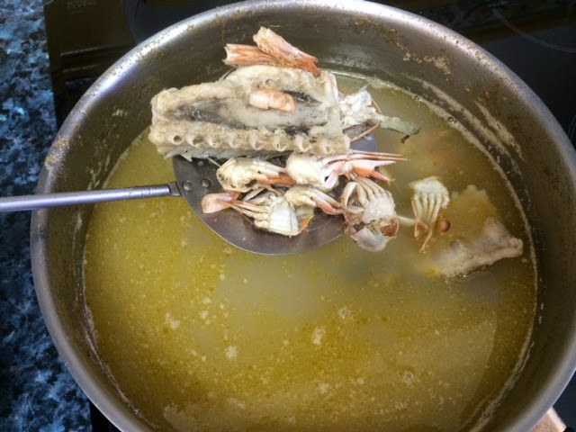 Cuando el caldo haya tomado consistencia, con una espumadera quitamos el marisco y el pescado.