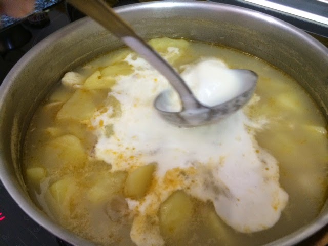 Apartamos parte del caldo en un recipiente y dejamos unos minutos para que pierda temperatura. Cogemos con una cuchara un poco de la mayonesa y vamos añadiéndola al caldo moviendo la cuchara siempre hacia el mismo sentido. Seguimos con el proceso hasta que hayamos integrado toda la mayonesa. Llegados a este punto y sin dejar de mover vertemos con la ayuda de un cucharón poco a poco parte del caldo que dejamos en la cacerola con las patatas.