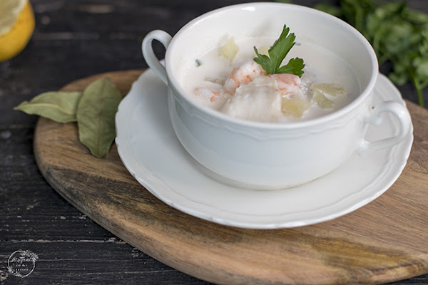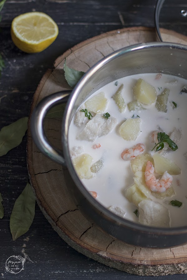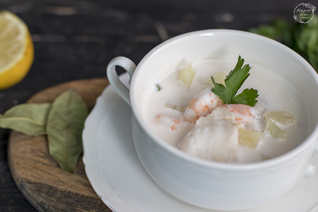 La versión que he preparado en casa lleva merluza y langostinos, que pueden ser gambas. Es verdad que el único secreto de esta sopa es evitar que la mayonesa se corte al añadirla a la sopa, por lo que ésto hay que ir haciéndolo poco a poco.