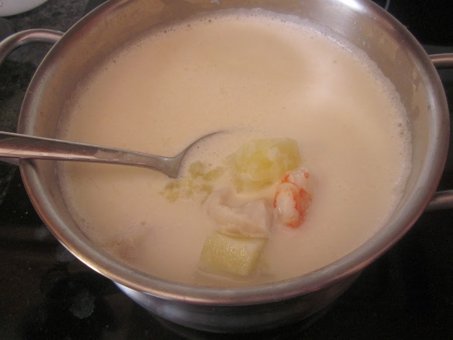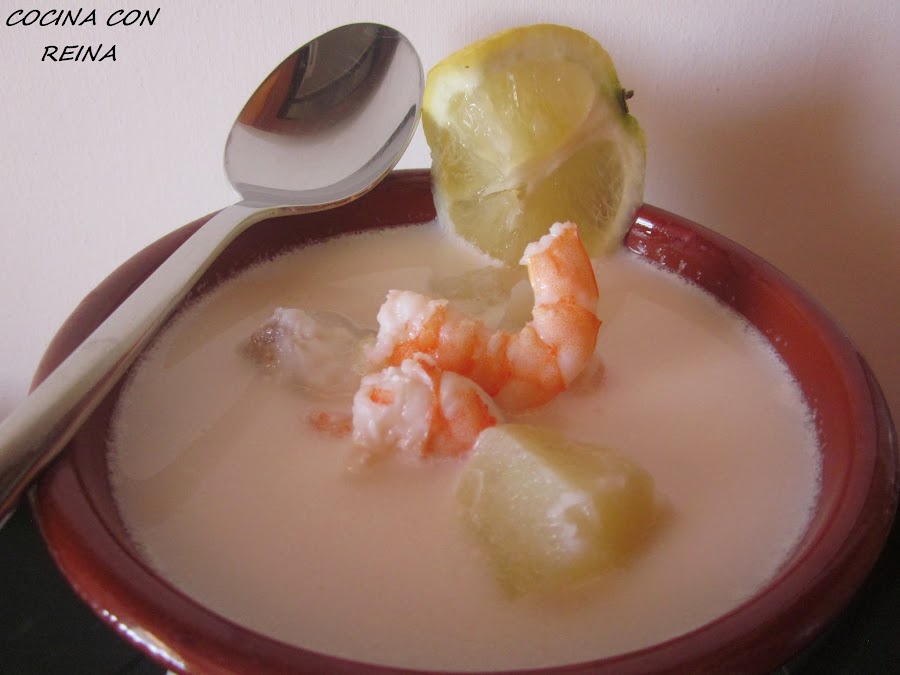 Pasado los 20 minutos, añadimos las gambas y el pescado,cuando empiece a hervir,apartamos del fuego,el pescado blanco se hace muy pronto.