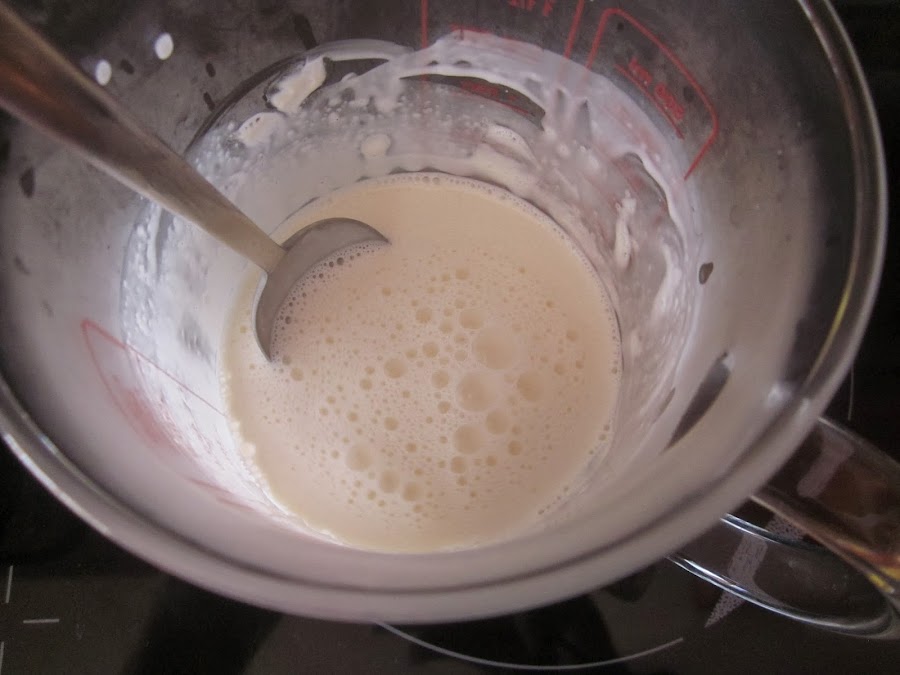 Cuando enfríe un poco, sacamos agua de la olla y vertemos en la jarra donde tenemos la mayonesa,mezclamos,añadimos un poco mas y mezclamos,se hace poco a poco y con el agua templada para que no se corte la mayonesa.
