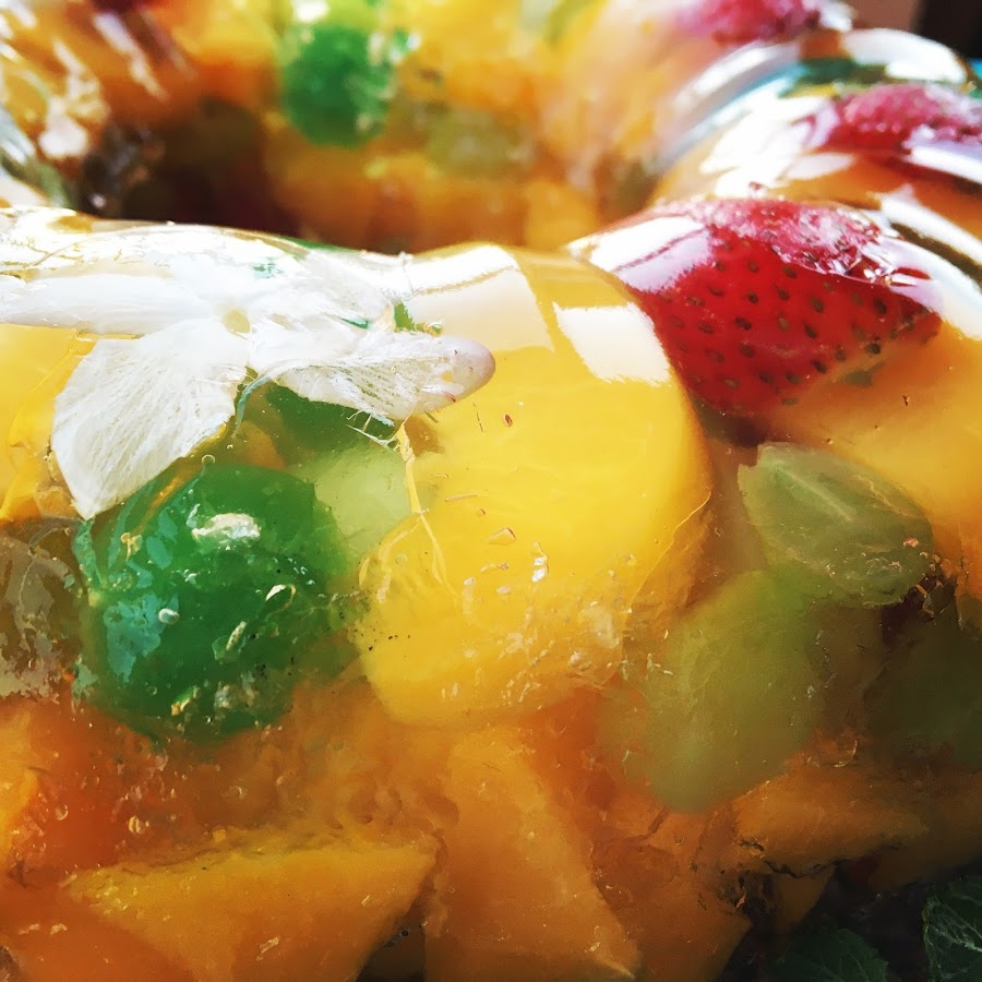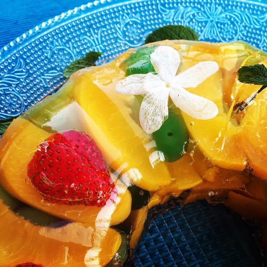 (Gelatina con fiori di frutta e gelsomino. Torta di Audrey Hepburn)