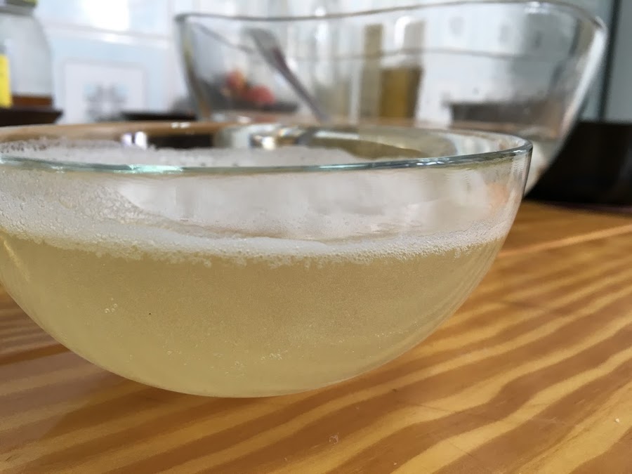 En ese momento, cuando lo tengamos líquido lo añadimos a la mezcla de agua y azúcar del bol, y lo removemos todo para que se mezcle y quede todo muy bien integrado.
