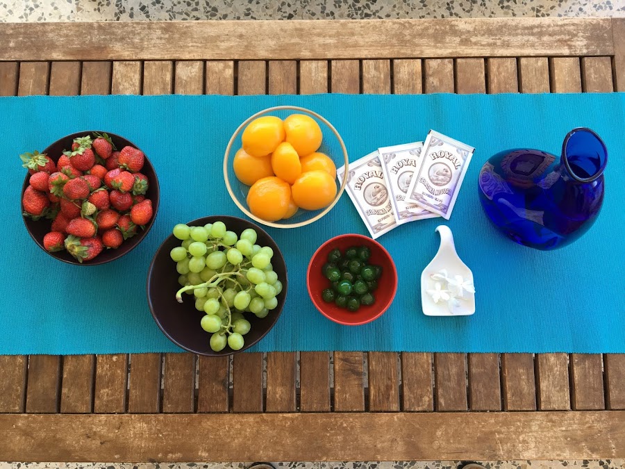 2.- Vamos componiendo las capas de nuestra gelatina con fruta y jazmín.