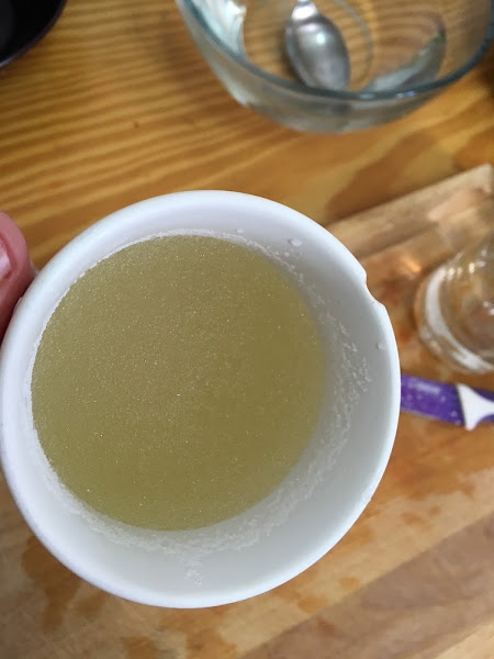 A continuación, cuando lo tengamos gelificado, pondremos la taza en el microondas unos 15 segundos (hasta que el gel se vuelva líquido) o si no tenemos microoondas, tal y como yo lo hice, lo pondremos al baño maría hasta que el gel se convierta en líquido.