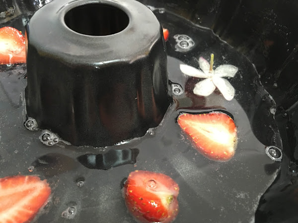 Primero colocaremos en el fondo unas fresas cortadas por la mitad y unas flores de jazmín (tened en cuenta que las colocamos al revés porque cuando desmoldemos esa será la parte de arriba y nos interesa que se vean del derecho). Con cuidado añadimos un poco del líquido que tenemos en el bol y lo llevamos a la nevera para que se enfrie y la gelatina nos asegure y pegue las fresas y las flores donde queremos y no floten y se descoloquen cuando vertamos más líquido.