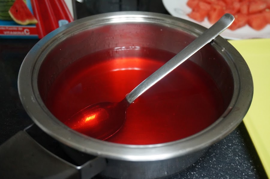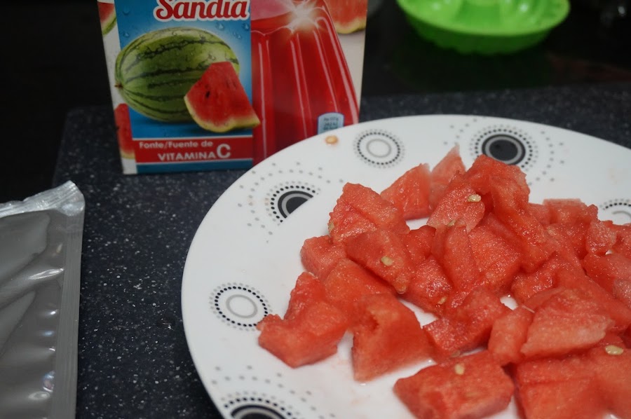 La sandía es la fruta del verano, ya que fresquita está muy buena y con la gelatina queda un postre diferente y con los trocitos de sandía que lleva queda muy bien.
