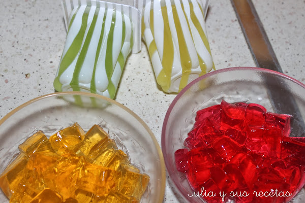 Partimos las gelatinas de colores en cuadrados, no demasiado pequeños.