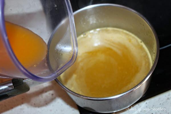 En un cazo ponemos un poco de zumo de mandarina , lo llevamos al fuego y cuando empiece a hervir lo retiramos y añadimos la gelatina escurrida. Movemos bien hasta que se disuelva. Añadimos el resto de zumo poco a poco.