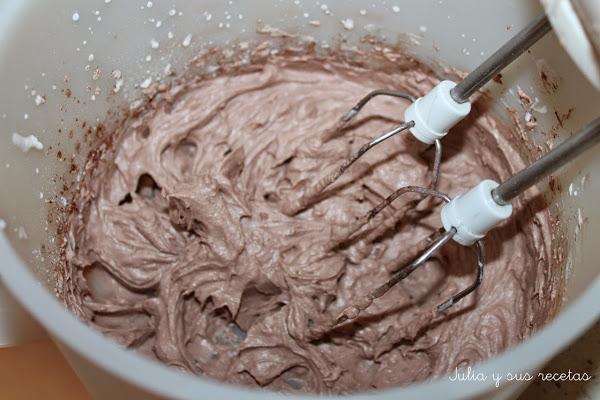 Montamos la nata (crema de leche) (el recipiente y la nata (crema de leche) bien fríos), cuando haya cogido consistencia le añadimos el azúcar poco a a poco y cuando esté compacta añadimos el cacao puro. Batimos hasta que se incorpore bien, añadimos el queso y batimos otro poquito.