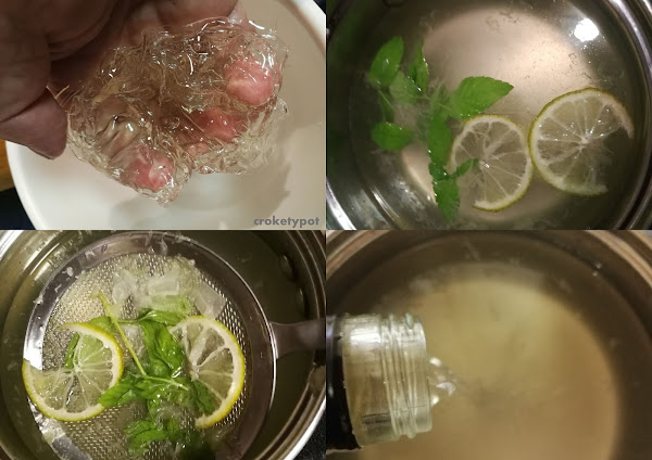 ELABORACIÓN: Ponemos en un bol las láminas de gelatina con agua fría para hidratarlas.