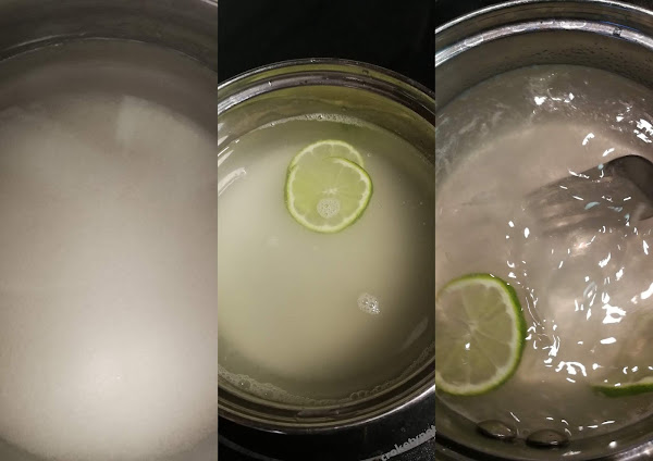 En un cazo se vierte el azúcar, el agua y el zumo de lima y dos rodajitas de lima. Lo calentamos a fuego medio, no hace falta que hierva, removiendo hasta que el azúcar esté disuelto, entonces lo retiramos del fuego y añadimos la gelatina, removemos.