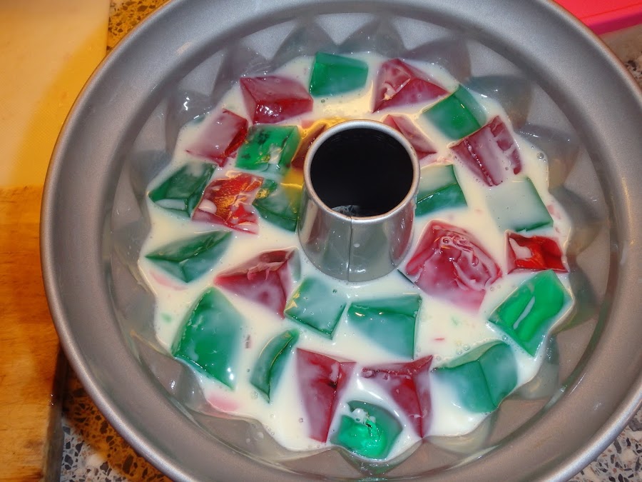 Vamos a preparar la gelatina de Navidad, untamos con aceite de girasol el molde donde la prepararemos. Seguidamente cuando tenemos las gelatinas de colores cuajadas las desmoldamos con cuidado y cortamos cubos con ellas que iremos colocando en el molde con cuidado y procurando variar los colores.