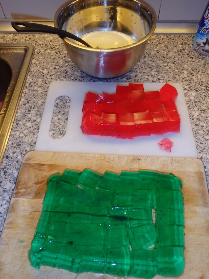 Preparamos las dos gelatinas de sabores siguiendo las instrucciones del fabricante. Si no son de color rojo y verde utilizamos colorante alimentario para conseguir estos colores. En mi caso la de limón era amarilla así que añadí colorante azul para conseguir un bonito verde.