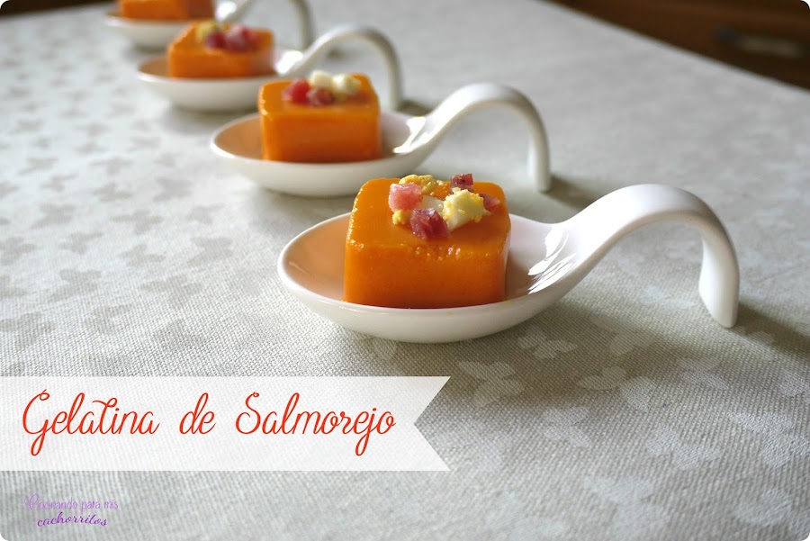 Hoy os quiero enseñar otra forma de presentarlo que queda súper cuqui, sobre todo para cuando tenemos invitados en casa porque esta gelatina de salmorejo servida en cucharitas queda muy elegante.