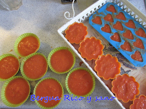 4. Rellenamos entonces los moldes de silicona con el salmorejo (mejor si son moldes de formas sencillas). Estará muy líquido, ya que el agar-agar gelifica al enfriarse. Pasadas un par de horas ya se notará la diferencia en la consistencia y se puede usar. Si queremos, podemos hacerlo de un día para otro. Lo importante es que haya tomado la consistencia de una gelatina y que esté bien frío.