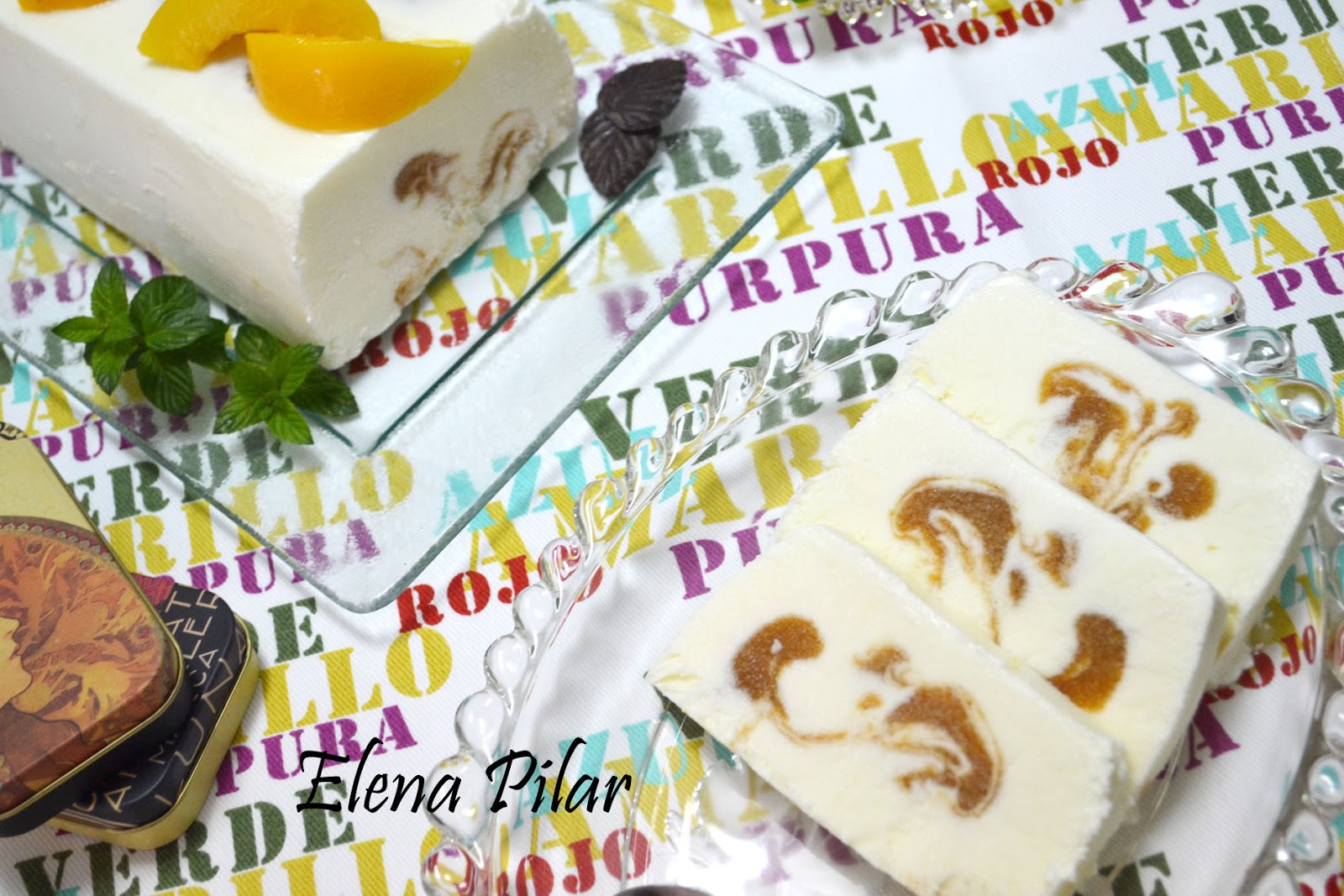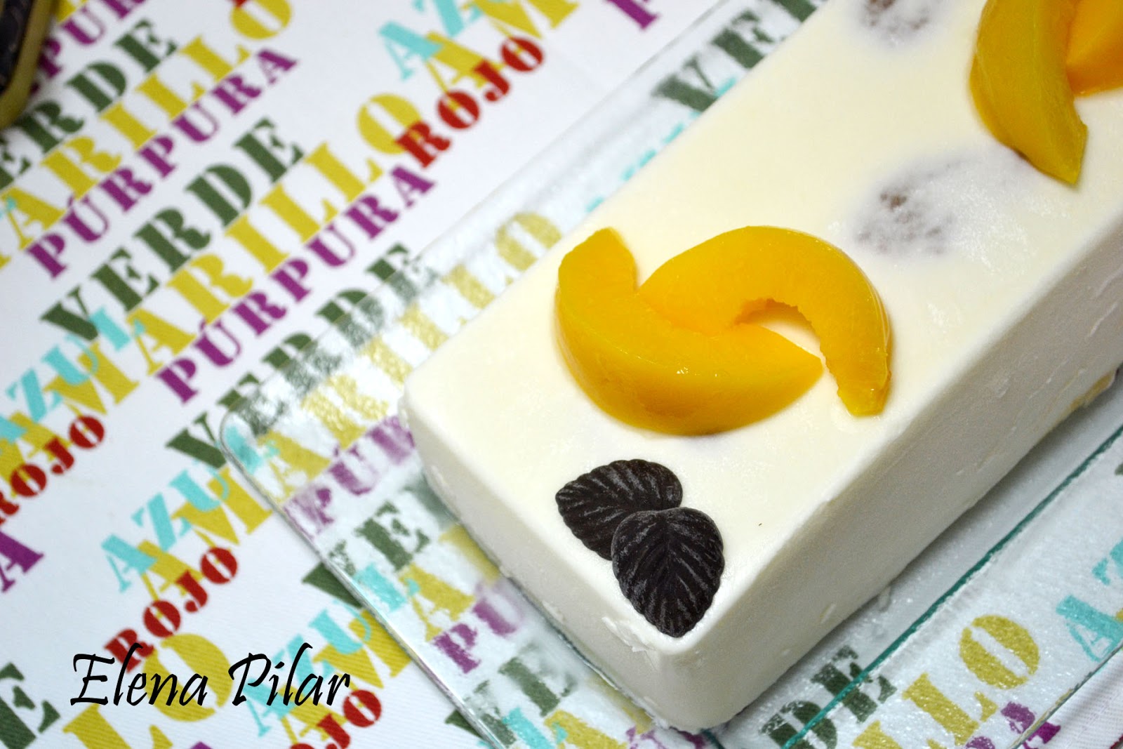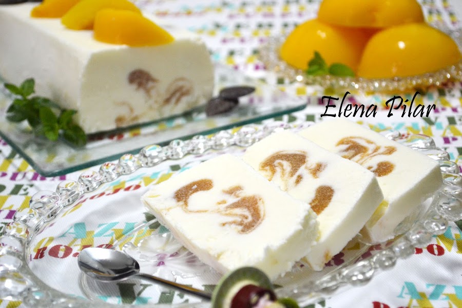 El postre de hoy consiste en una gelatina de yogur y nata montada (crema de leche) que tiene, a su vez, otra gelatina de melocotón en su interior. En la receta original, la mezcla de yogur no llevaba gelatina; sin embargo, yo se la he añadido. De esta manera, una vez que el pastel ya está congelado y perfectamente cuajado, lo podremos mantener en la nevera sin que pierda la forma. Además, os aseguro que así estará mucho más rico que completamente helado y apreciaréis mucho más los sabores.
