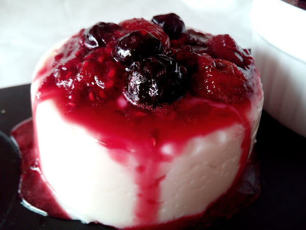 Pasadas las dos horas, desmoldamos las gelatinas dando unas ligeras sacudidas a los moldes y bañamos con el topping de frutos rojos.