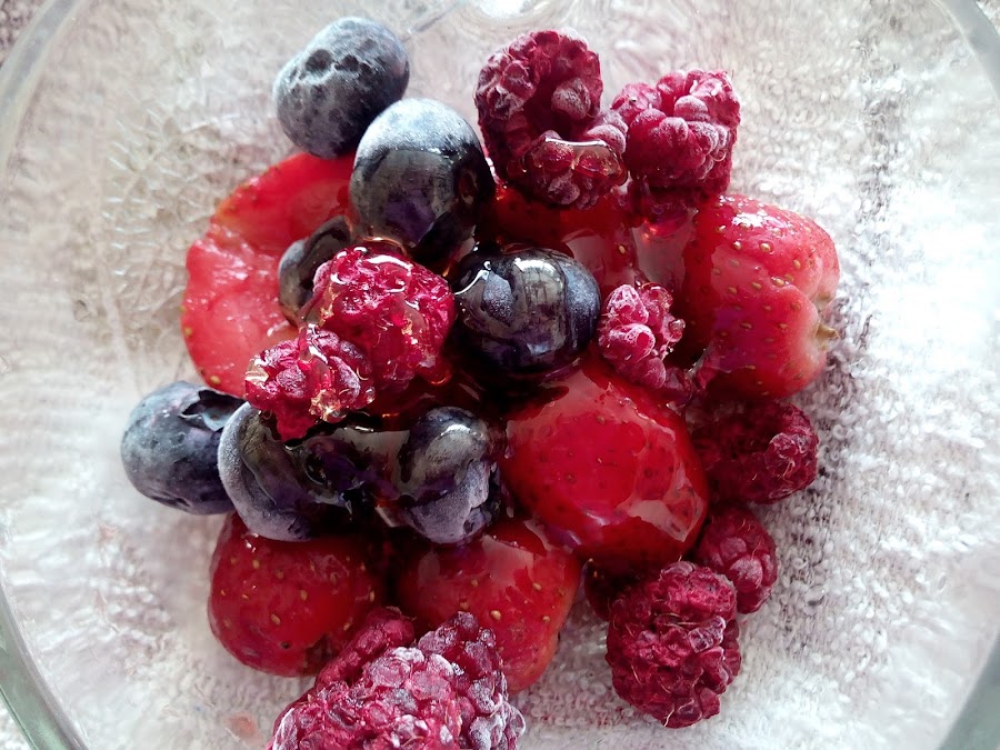 Mientras tanto, colocamos los frutos rojos con la miel y ponemos por 1:30 minutos al microondas.