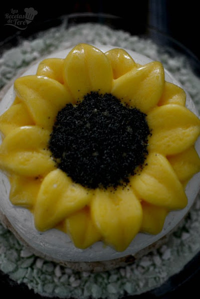 Hola a todos...No puedo estar más contenta con este postre, delicioso y bonito de llevar a la mesa... Estaba visitando la blogosfera y me encontré con esta espectacular receta, del maravilloso blog "Mis dulces joyas", me dije a mi misma, la tengo que hacer cuanto antes, así que me puse manos a la obra y aquí tenéis el resultado. Tiene 4 preparaciones pero no son difíciles y el resultado vale la pena. Hice mi versión en forma de girasol, lo único que necesitas es un molde de silicona ya sea plano o de cualquier forma y un molde para hacer el bizcocho.