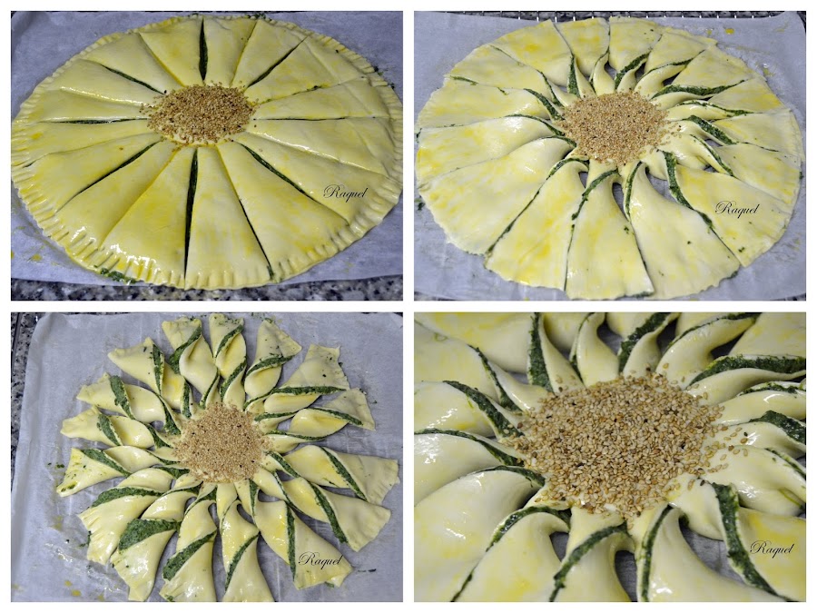 Batimos un huevo y pintamos el hojaldre, ponemos sésamo en el centro como si de un girasol se tratara.