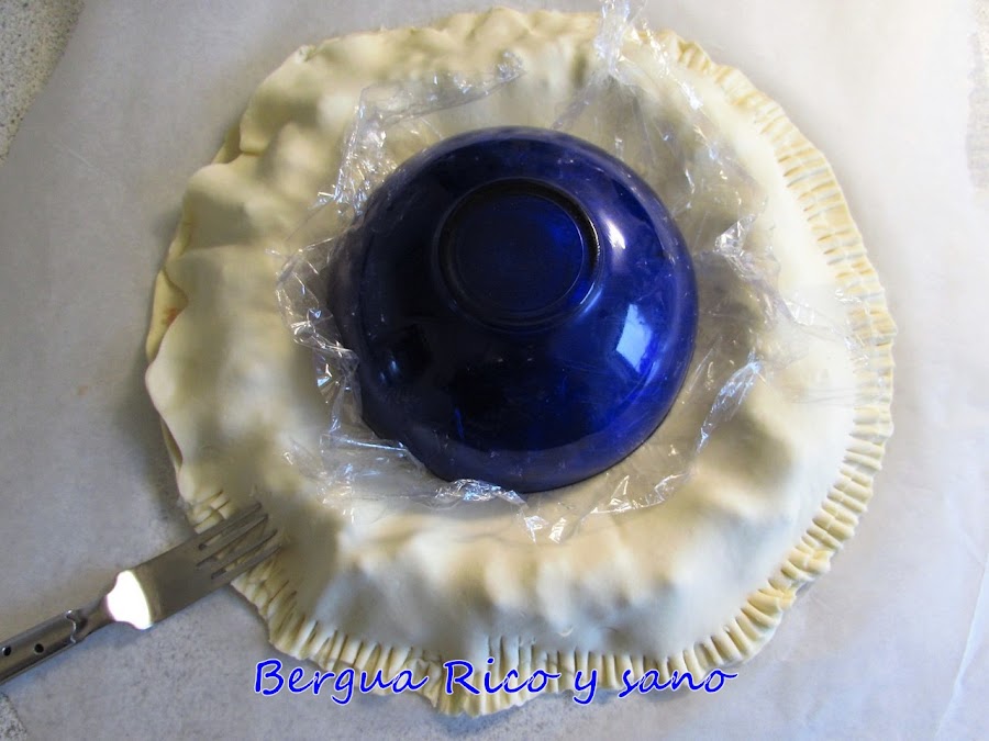 7. Entonces cubrimos con la segunda lámina de hojaldre. Volvemos a colocar el cuenco cubierto con papel film sobre la cúpula, por encima de la masa, y presionamos un poco para ayudar a marcar la forma y que la mantenga durante el horneado.