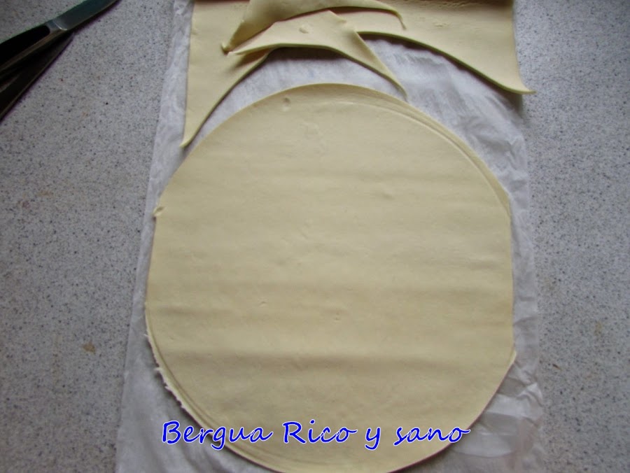 * Lo ideal es comprar es masa de hojaldre ya en formato redondo, pero si te es imposible encontrarla, como a mí, simplemente usa un plato redondo para cortar un círculo grande de cada placa de hojaldre y recicla los bordes en otra receta, por ejemplo estos cronuts.