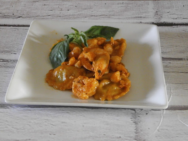 Por lo tanto: pasta con la cúrcuma (amarillo), relleno de aguacate (verde) , salsa hecha a base de bisque ligeramente alargado con muy poquita nata (crema de leche) (rojo) y langostinos.