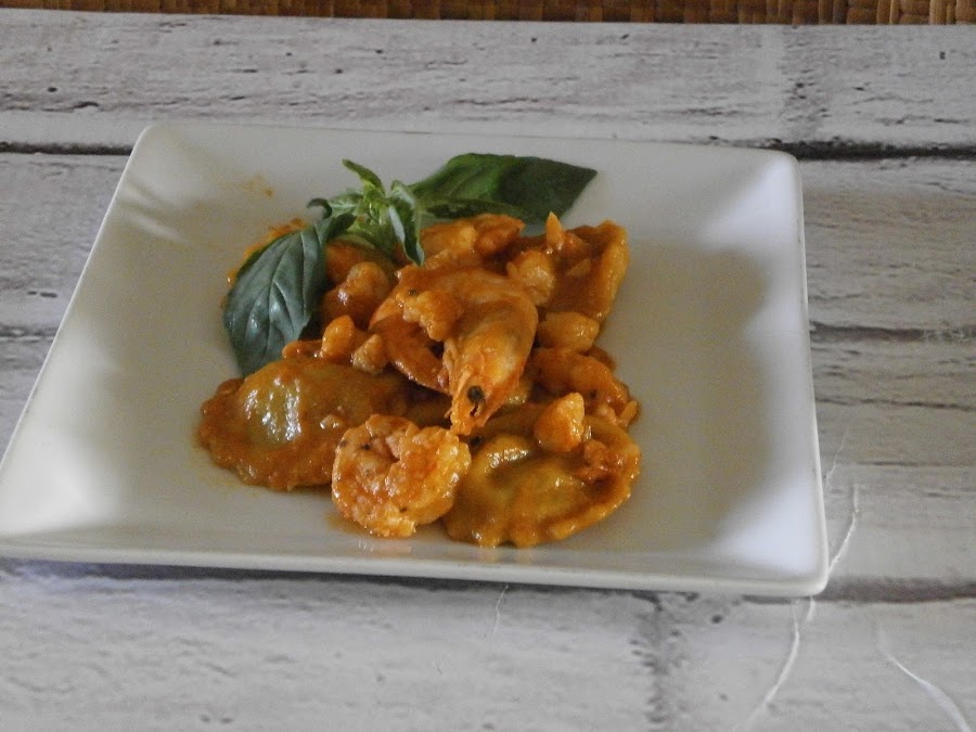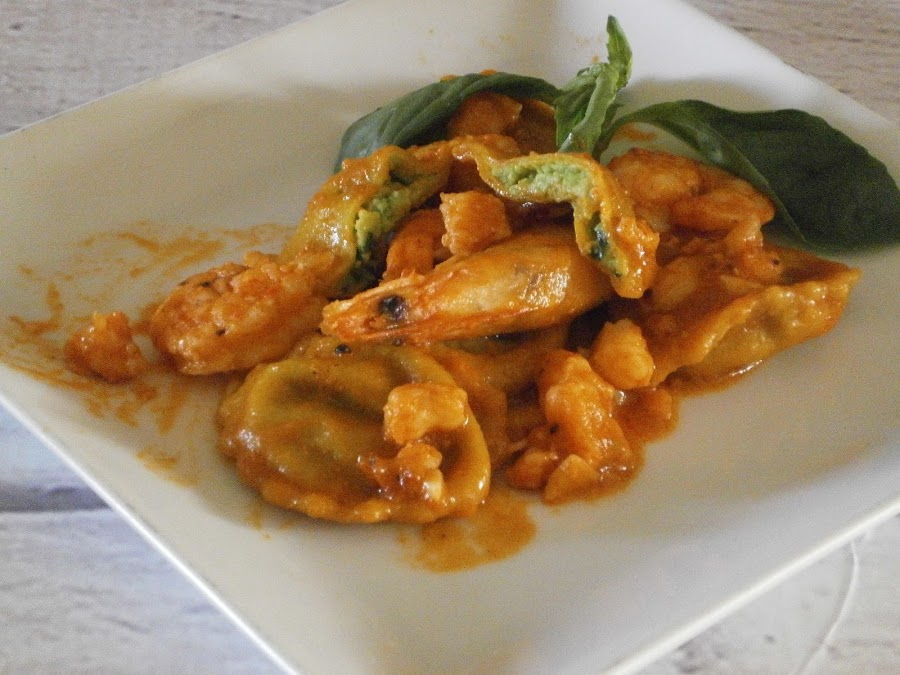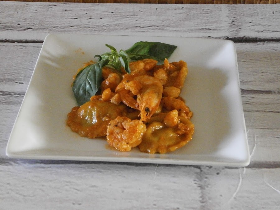 Quindi: pasta con curcuma (gialla-gialla), ripieno di avocado (verde), sugo fatto con un fondo di bisque leggermente allungata da pochissima panna (rosso)e con scampi.