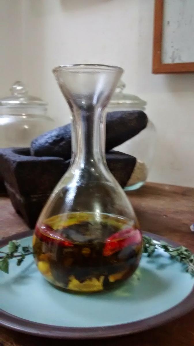 Aceite saborizado: en un frasco poner 2-3 dientes de ajo, pelados y enteros, una rama de orégano fresco y 1 -2 peperoncinos secos, una pizca de sal de mar, algunos granos de pimienta entero y rellenar con aceite de oliva, tapar y guardar al menos 1 semana antes de usar, ir rellenando con aceite a medida que se va utilizando. Duración máximo 3-4 semanas. (más tiempo toma un sabor extraño).