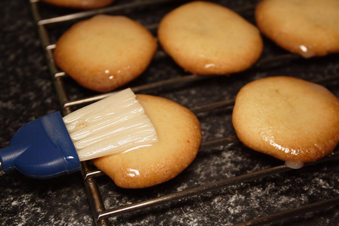 Con ayuda de un pincel, pintamos las galletas (bizcocho o postre elegido) por una de sus caras, con el glaseado de limón. Dejaremos secar sobre la misma rejilla durante un par de horas.