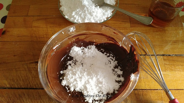 2. Una vez derretido le vamos a ir agregando, poco a poco, el azúcar glas y el licor diluído en agua, mezclandolo bien con unas varillas, hasta conseguir la textura deseada.