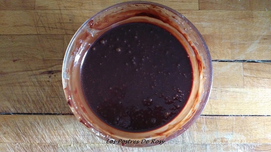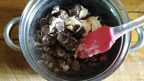 1. En un recipiente apto para el calor, ponemos el chocolate fondant junto con la mantequilla y lo derretimos al "baño maría"(también se puede hacer en el microondas, en tandas de pocos segundos, porque si nos pasamos de tiempo el chocolate se quema).