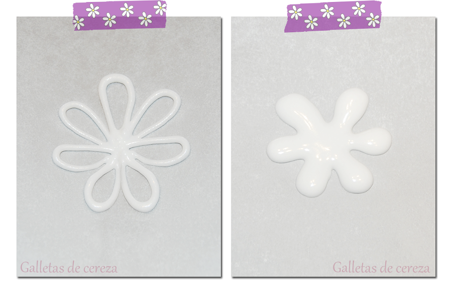 Otra manera de formar la margarita: hacemos cinco o seis bolitas y las unimos después hacia el centro (echando más glaseado). Si utilizamos relleno tendremos que separar los pétalos porque tenderán a juntarse. Si utilizamos delineado habrá que darle un poco de forma (que no queden picos ni mucha rugosidad) con un palillo.