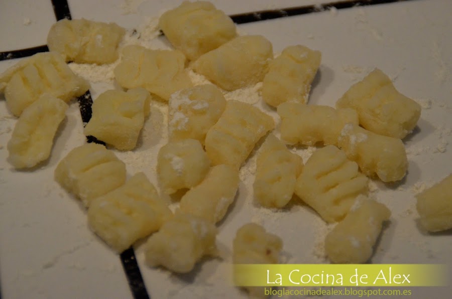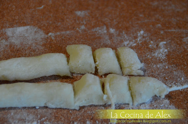 Cuando tengamos la masa le damos forma cilíndrica con la ayuda de las manos y la vamos cortando a nuestro gusto, según el tamaño que queramos. Podemos hacer unas marcas con el tenedor para que parezcan auténticos gnocchis. Y dejamos enfriar la masa 15-20min.