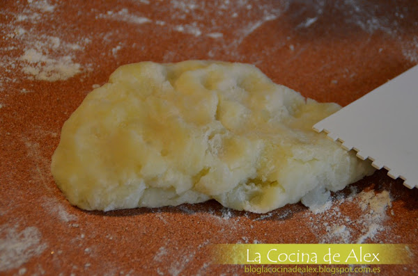 Ahora vamos ha hacer los gnocchis, espolvoreamos con un poco de harina la encimera de la cocina, amasamos el pure, añadimos el huevo batido y vamos espolvoreando con harina hasta si se nos pega demasiado (cuanto menos harina incorporemos mas jugosos estarán luego). Amasando hasta obtener una masa uniforme.