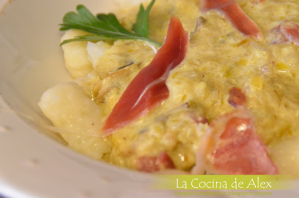 Para la presentación final, simplemente ponemos los gnocchis en el plato, salseamos con nuestra salsa de curry y podemos poner por encima unas lonchas de jamón que les dará un toque delicioso.
