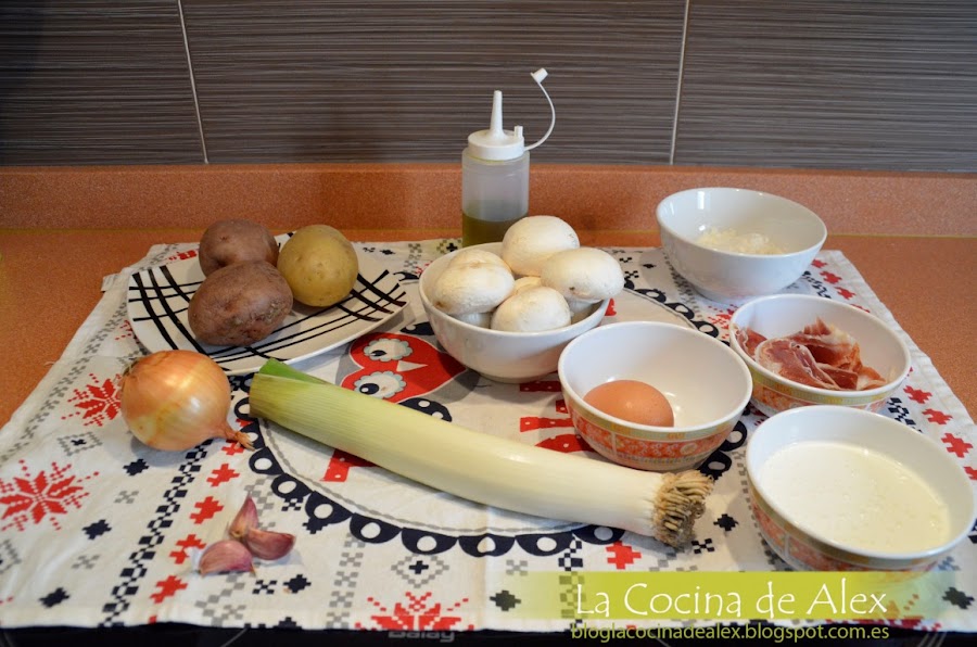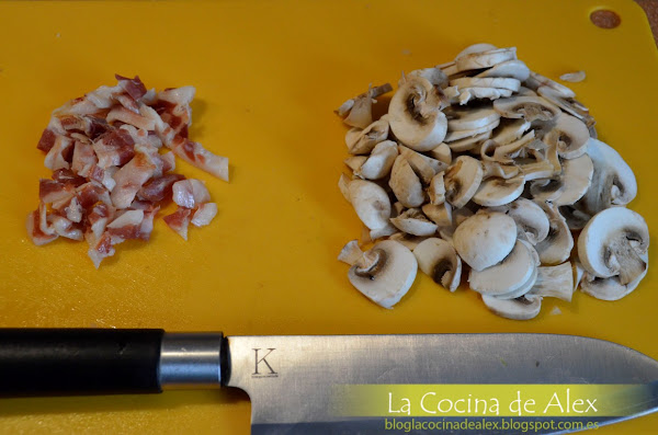 A continuación cortamos el champiñón en laminas y el jamón en trozos y lo añadimos a la verdura pochada para cocinarlo todo junto durante unos minutos.
