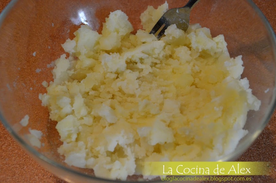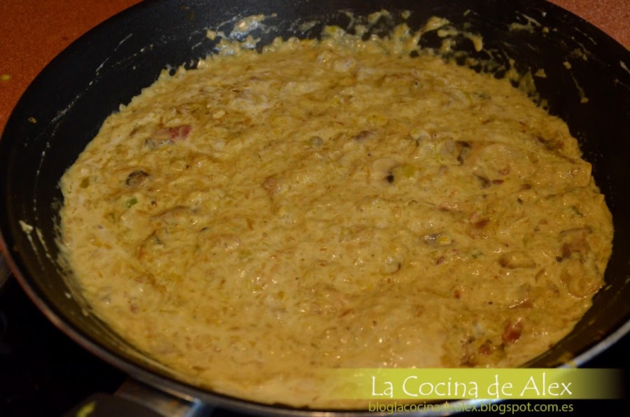 Cuando este todo cocinado añadimos la nata (crema de leche) liquida junto con la cucharada de curry (opcional) rectificamos de sal y dejamos reducir la salsa hasta que este a nuestro gusto. Con la patata cocida vamos ha hacer un puré plantándolas con la ayuda de un tenedor.