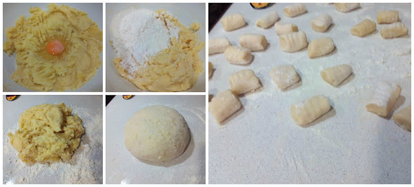 Las chafamos con un tenedor hasta obtener un puré, hacemos un hueco en el centro e incorporamos el huevo y una pizca de sal. Mezclamos bien para que se integre el huevo y echamos la mitad de la harina. Mezclamos y volcamos la masa en la encimera previamente enharinada. Amasamos añadiendo un poco mas de harina si hace falta que formar una masa que maleable y que no se nos pegue en las manos. Dividimos la masa en porciones iguales y estiramos hasta formar bastoncillos largos y de un dedo de grosor. Cortamos cada bastoncillo en trocitos de unos 3 cm, pasamos por un tenedor para hacerles las típicas hendiduras de los gnocchi y reservamos.